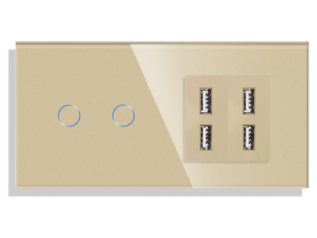 Vypínač Gala Touch 2 okruhy (řaz. č.5) + 2x Dual USB nabíječka, skleněný rámeček, zlatá