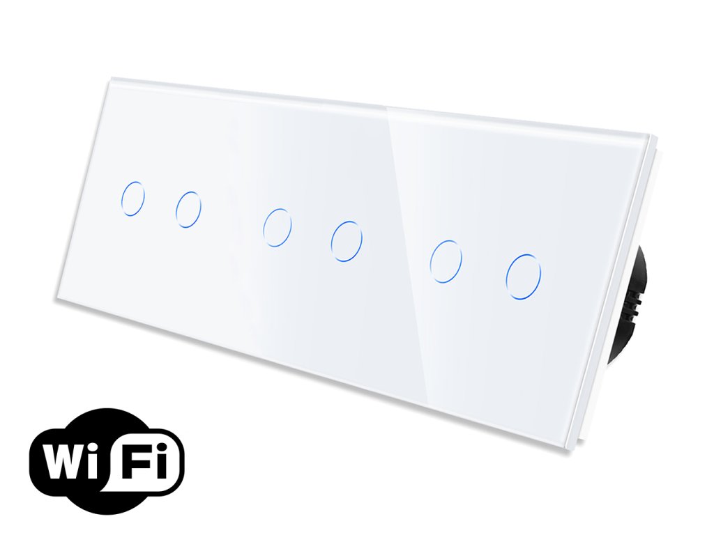 Dotykový WiFi vypínač 2 okruhy + 2 okruhy + 2 okruhy se využívá především k ovládání šesti světelných okruhů z libovolného počtu míst. Kompatibilní s Google Assistant, Amazon Alexa, Tuya Smart, IFTTT. Možno nastavovat různé časovatelné scénáře nebo ovládat více vypínačů najednou.