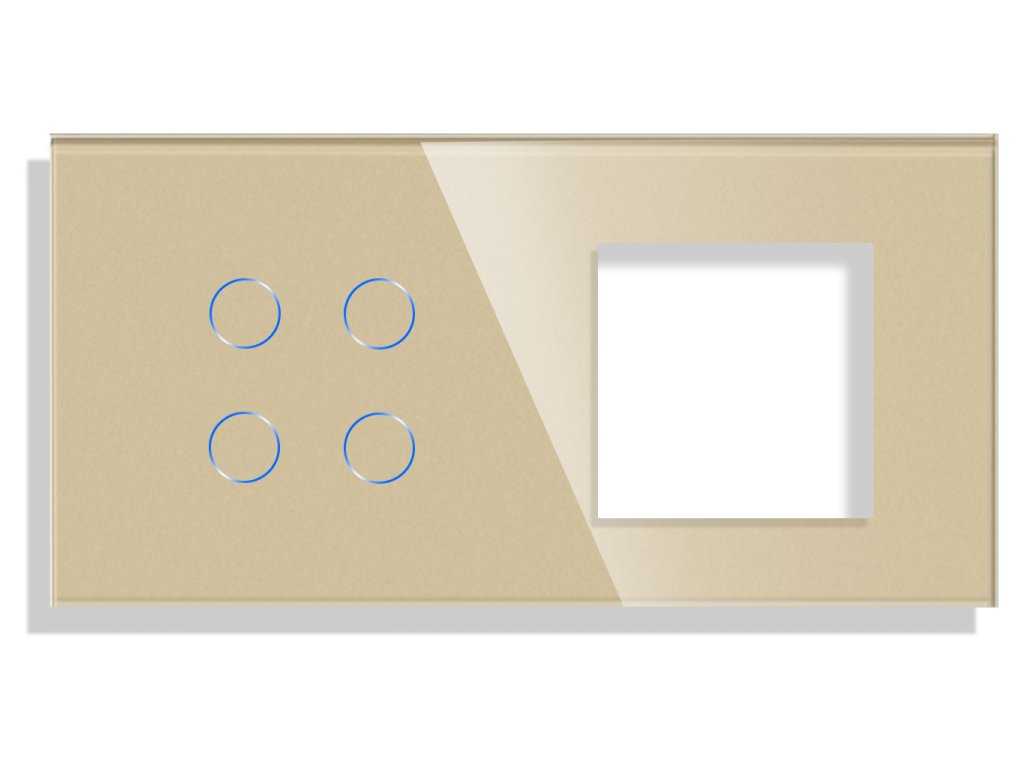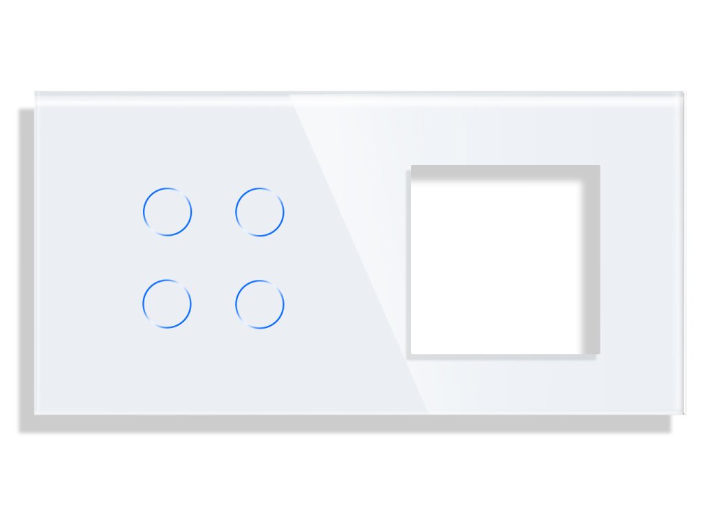 Exkluzivní dotykový panel Gala Touch s rámečkem z tvrzeného skla pro dvojkombinaci jednoho čtyřtlačítkového strojku a jednoho funkčního modulu. Panel je díky svému povrchu snadno omyvatelný, v případě rozbití nikdy nepředstavuje riziko pořezání, je stálobarevný a nehořlavý. Součástí panelu je i kovová základna určená k osazování dotykových strojků.