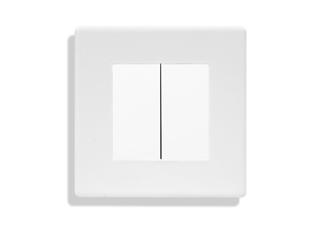 Dvojvypínač řazení číslo 6+6 v plastovém rámečku Poly. K ovládání dvou světelných okruhů ze dvou míst (v kombinaci s dalším vypínačem s řazením číslo 6+6).