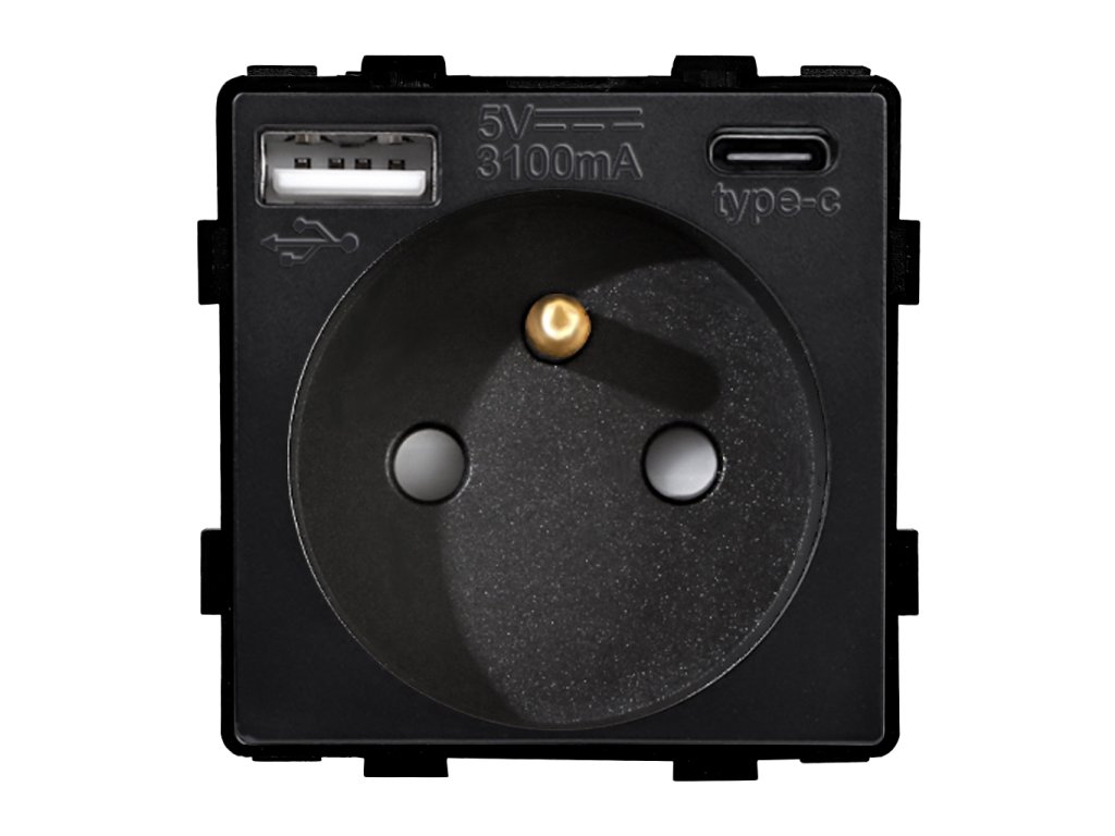 Modul zásuvky 230 V s nabíječkami pro USB-A a USB-C, který je kompatibilní s libovolným naším rámečkem. Maximální nabíjecí proud pro každý USB port je 3,1 A.