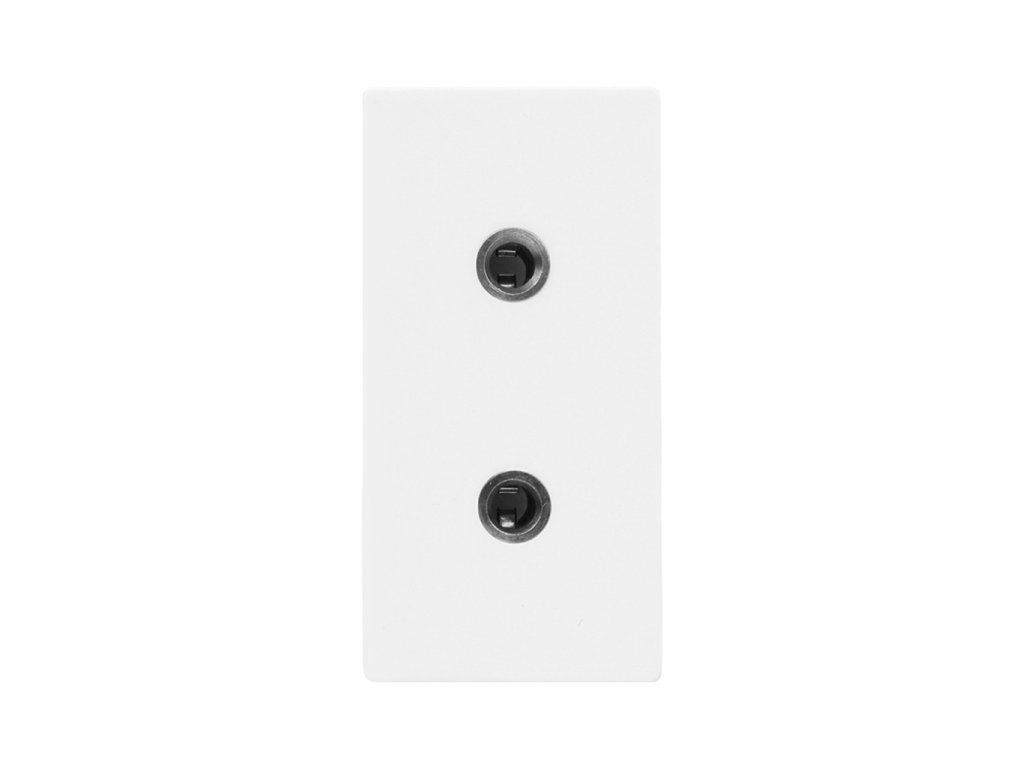 Půlmodul dvojité koncové zásuvky 3.5mm jack. Přívodní kabely jsou vzadu zapojeny skrz šroubové svorky.