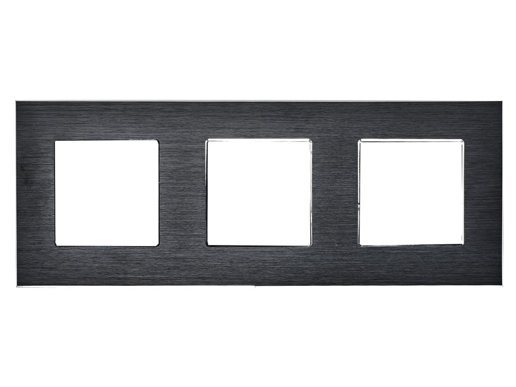 Trojmístný rámeček z broušeného hliníku s kovovou základnou, s možností barevné kombinace s jakoukoliv barvou modulu. S rozměry 228 x 86 mm je vhodný pro standardní instalační krabice a umožňuje jednoduché osazení modulů a dotykových vypínačů.