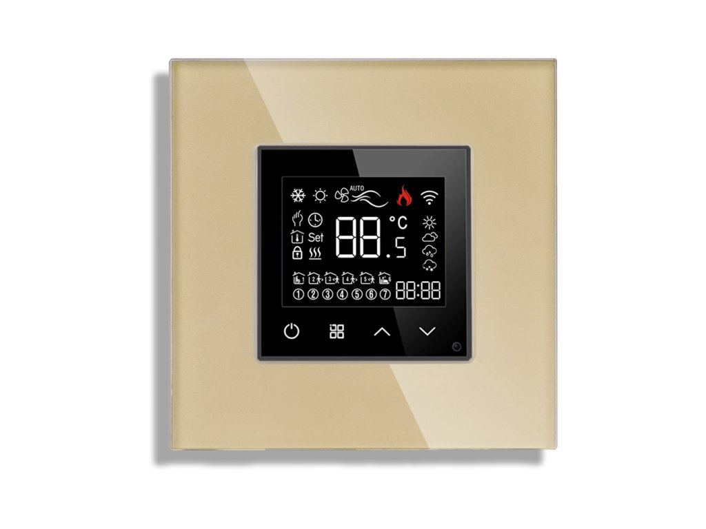Dotykový WiFi termostat v skleněném rámečku Gala. Vhodný pro regulování teploty topení nebo ohřevu vody.