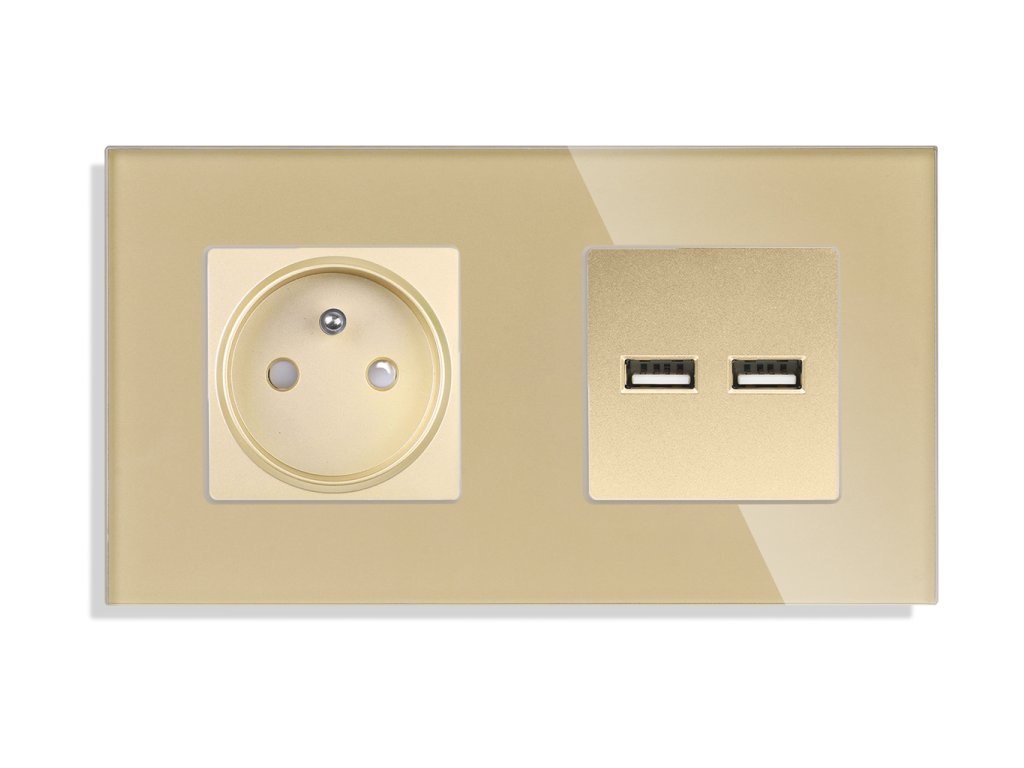 Zásuvka Gala + Dual USB nabíječka, skleněný rámeček, zlatá
