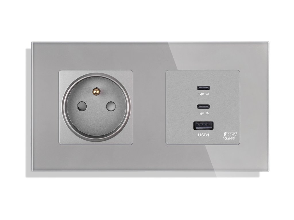 Zásuvka Gala + nabíječka 2x USB-C + USB-A, skleněný rámeček, šedá