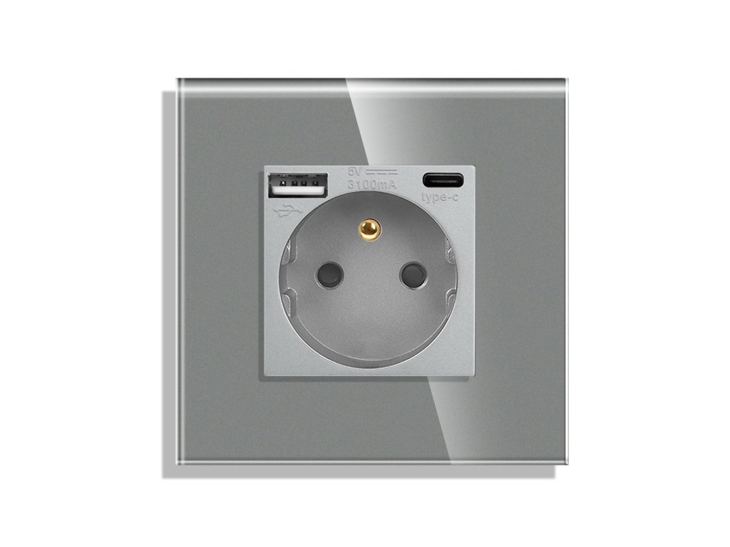 Zásuvka Gala s USB-A a USB-C, skleněný rámeček, šedá