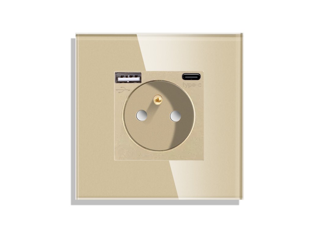 Zásuvka Gala s USB-A a USB-C, skleněný rámeček, zlatá